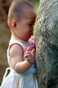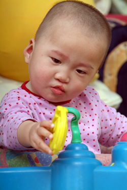 She hasn't disappointed me. Even though she has been diagnosed as both deft and possibly autistic, I feel in my heart that she's resilient enough to prevail, if she continues to receive the kind of love and care she has received at Blue Sky. Despite her deft diagnosis, I found her unusually interested in xylophone, playing with longer attention span than other children. And even though she displays one of the classic syndromes of autism, lack of eye contact with people, I have seen a change even in that. Over the past months, she went from making no eye contact at all, to a fleeting glance, to actually looking at me for the briefest moment, to holding my gaze for a few seconds. I can't help but wonder if she's truly autistic? Could she just be reclusive because she had spun a thick, hard cocoon to protect herself in those five months of abandonment and would she not eventually emerge from her cocoon given enough time and encouragement? Wouldn't we expect her development to be slower if she started the race five months behind others but could she not eventually catch up if given adequate and continuous stimulation? There is no miracle story here. Blue Sky has given Hui Jing a chance to participate in life, but I worry about the day she may have to leave Blue Sky due to a variety of possible reasons. My greatest wish for her is that an especially caring family would see her as their special child and decide to include her in their lives. Realistically, however, she doesn't stand the same chance for adoption as other children. She is a special needs child in more ways than most Blue Sky children. Her development will be an uphill battle for the foreseeable future. Yet, I see her persevering. So I share a little of my experience with her here, hoping that it will touch a chord with someone out there, who will be willing to continue what Blue Sky has started, giving her every chance there is, supporting her perseverance at living her life.