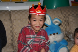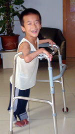 been amazing, and the doctors are very pleased with his progress. He is now sporting a mohawk hairstyle, as a result of having an IV drip inserting into the vein on his head. JiDe is all smiles and giggles now. * Jian Gong, our 7yr old with arthrogryposis, was the lucky recipient of a wheelchair donated by Pfizer Pharmaceuticals. It is a little bit big for him, but he seems to be able to manuever his way around anyway. After more consultations with doctors in Beijing, Jian Gong will most likely have surgery on his feet and knee after chinese new year. In the meantime, he has been learning how to count (up to 10 now) and is starting to recognise a few characters. He is very willing to learn and is such a polite boy. He and Dang Qian have become good friends.