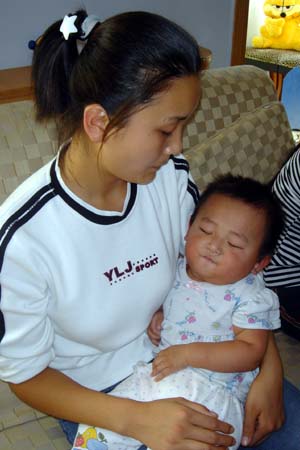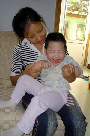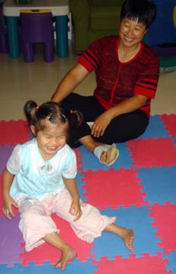 ZhengLin is 5 years old and is blind. Her caretaker is being trained with us on how to better care for ZhengLin. She's a lovely girl with the cutest giggle.